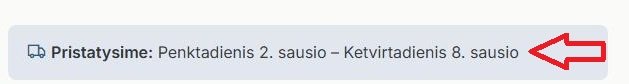 Prekių pristatymo terminas yra nurodytas prekės puslapyje po mygtuku „Į krepšelį”. Pvz.: