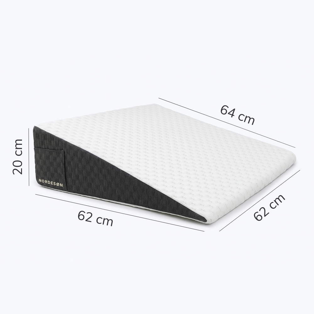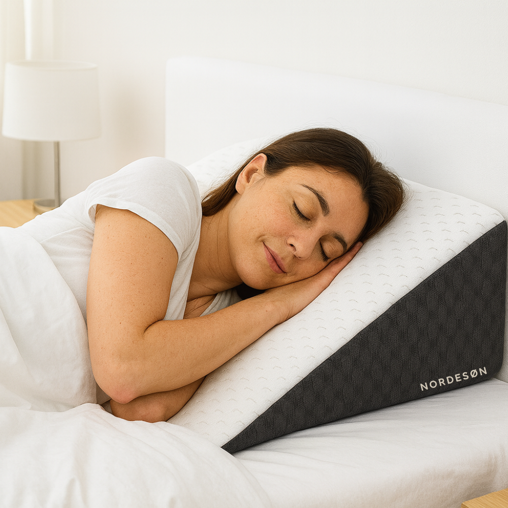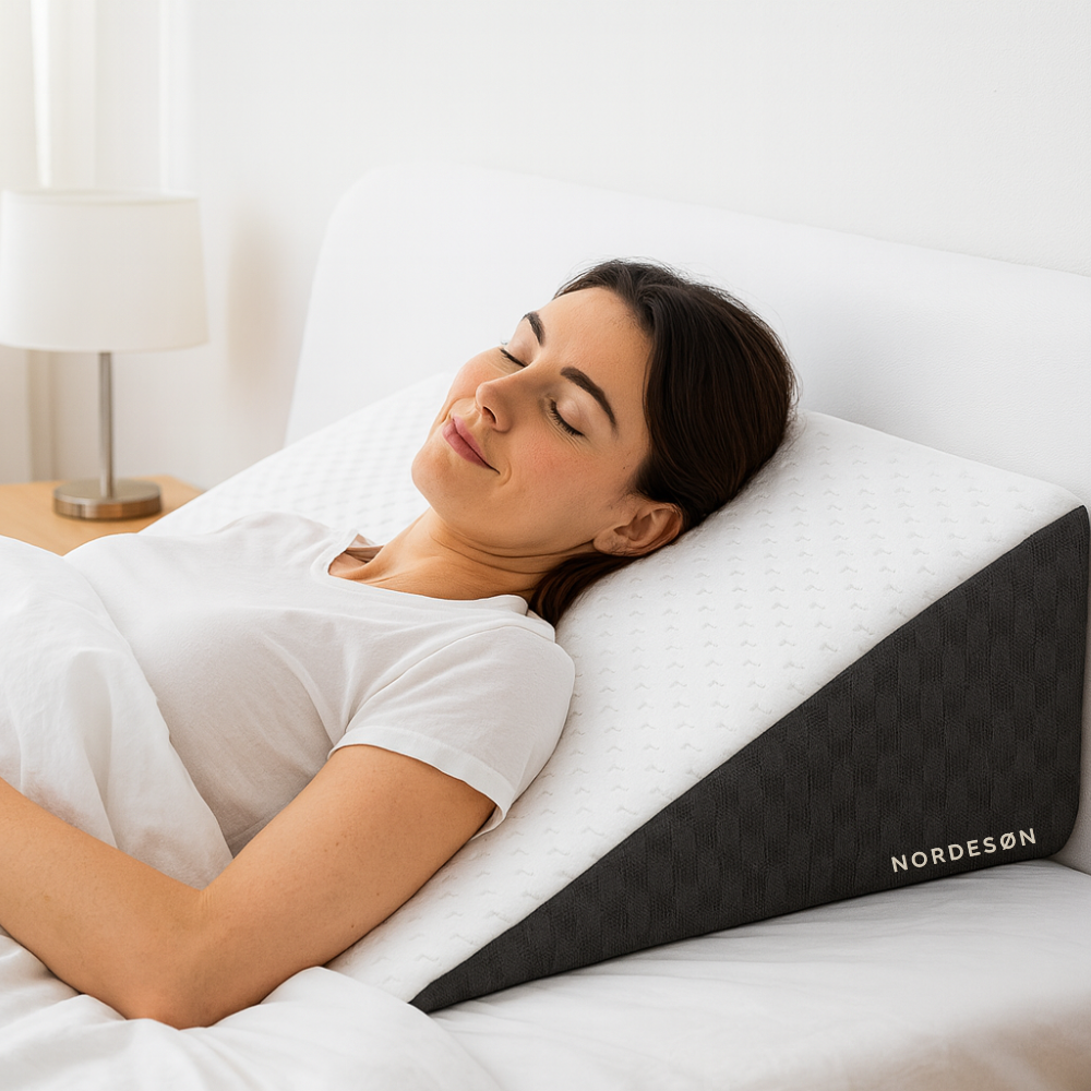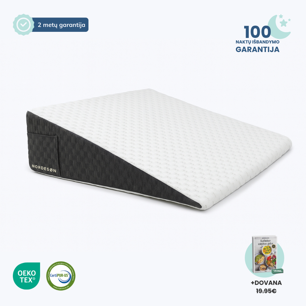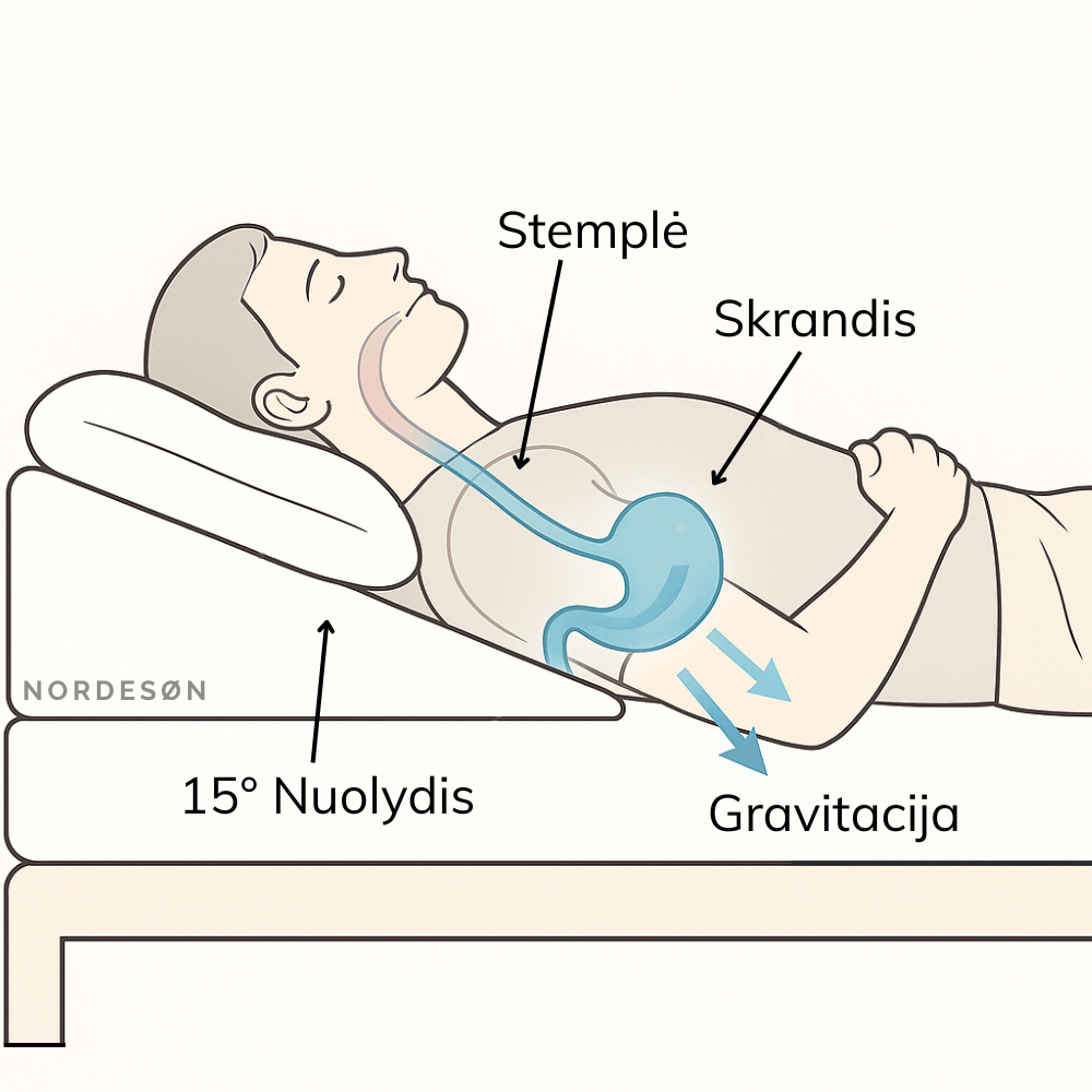 Nordeson™ ergonominė pagalvė remiasi moksliškai pagrįstu laipsniško nuolydžio metodu (IBT), kuris švelniai pakelia jūsų viršutinę kūno dalį 15° kampu – kad gravitacija natūraliai padėtų rūgščiai likti skrandyje, o ne kilti į stemplę.