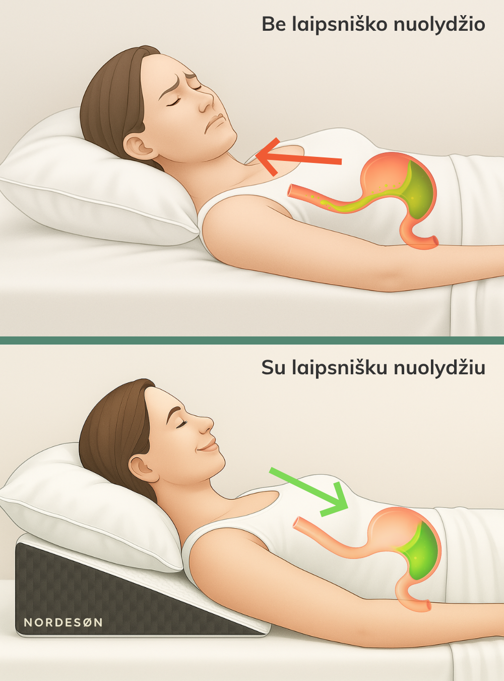 Rūgšties refliuksas sumažėja jau per pirmas naktis – kartu dingsta spaudimas po krūtine, deginimas ir nemalonus skonis burnoje.